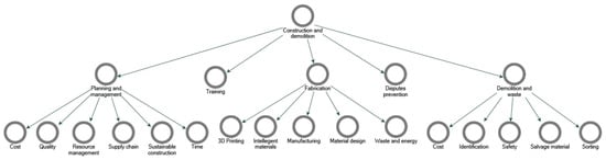 Figure 7 presents a thematic tree for construction and demolition, highlighting the role of GenAI in planning and management, fabrication, demolition, waste, dispute prevention, and training. GenAI generates future scenarios (for example, risk assessments) that help construction and site managers anticipate and respond to upcoming opportunities and problems, enabling sound decisions (risk mitigation). LLMS such as GPT-3 have been shown to allow for intuitive interactions and communication between project stakeholders and the DT of construction sites. Producing human-like text, LLMs facilitate information analysis, interpretation, and scenario propositions, which enables informed decision-making [39]. Inherent in their development mechanisms, LLMs continuously learn and improve, which may contribute to further confidence in case-specific contexts and/or non-traditional scenarios. This strategic thinking is cost- and time-effective compared to traditional risk management methods, which heavily rely on the professional judgement of individuals [52].