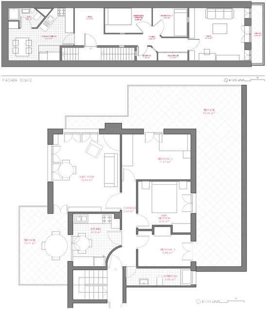 To understand the thermal conditions and vulnerability of elderly individuals living alone during heatwaves, two representative case studies were selected: one in the urban context of Pasaia and the other in the peri-urban/rural context of Bidania-Goiatz, both located in the Basque Country with a temperate oceanic climate (Cfb, according to Köppen–Geiger) in Spain. People inhabiting both dwellings were over 65 years, lived alone, had autonomy, and received periodic assistance. Both dwellings are situated on the upper floors of residential buildings without elevators— a condition that increases the vulnerability of older residents in the face of extreme heat and reduced mobility.