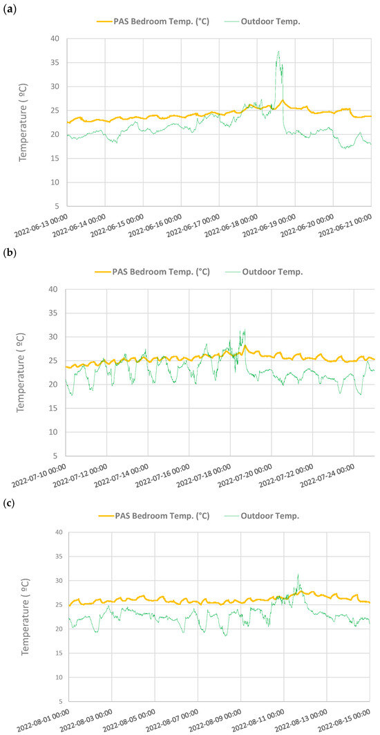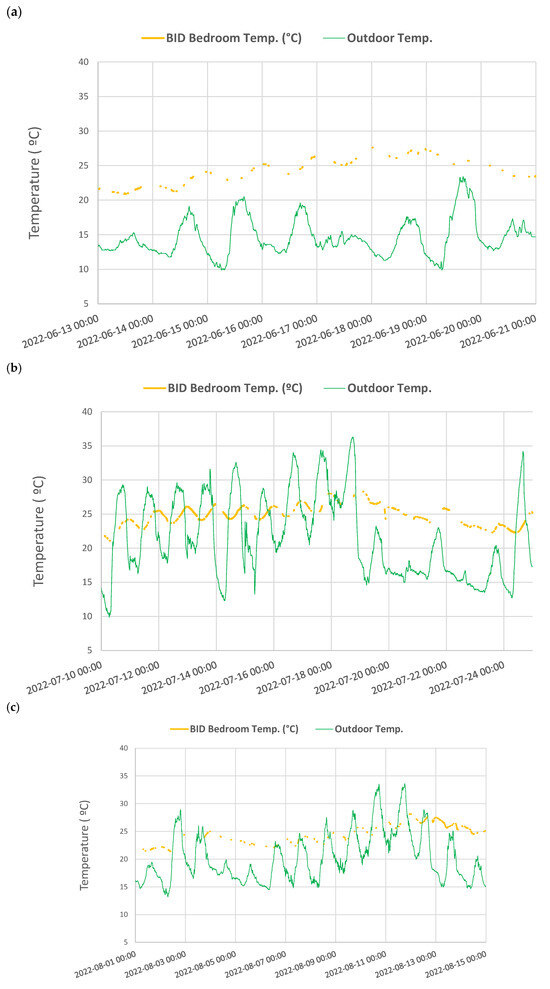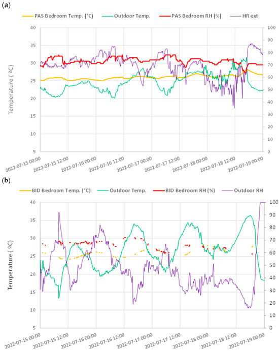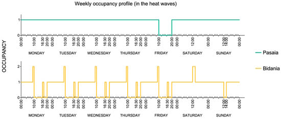 The two dwellings were monitored between March and October 2022, a period marked by prolonged high temperatures and three notable heatwaves. Measurements included indoor temperature, relative humidity, CO2 concentration, light levels, power consumption, and occupancy presence, recorded at 10 min intervals in three representative rooms: the living room, kitchen, and bedroom. The dwellings remained occupied under normal use patterns during this period. Outdoor conditions were also measured through onsite sensors and official data from Euskalmet stations in Pasaia and Bidania-Goiatz. These measurements enabled the calculation of the heat index [51,52] and application of adaptive thermal comfort models according to EN 16798-1 standards.