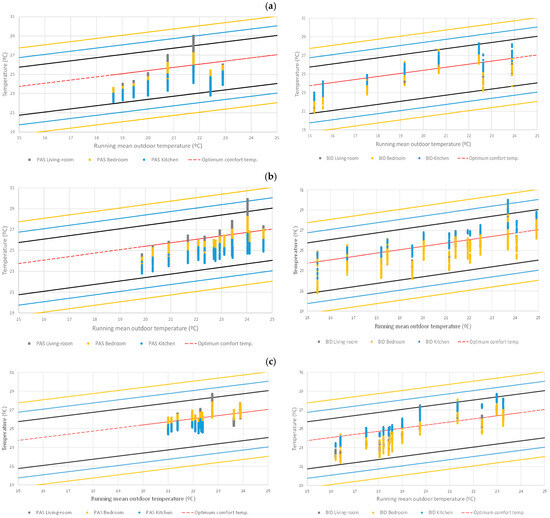 Thermal comfort was assessed using the Adaptive Model of Thermal Comfort, as defined by the EN 16798-1:2020 [31] and ASHRAE 55-2013 [55] standard, particularly suitable for naturally ventilated dwellings without active cooling systems, where occupants adapt to indoor conditions through behavioural and physiological changes—a typical situation in the homes of elderly individuals living alone.