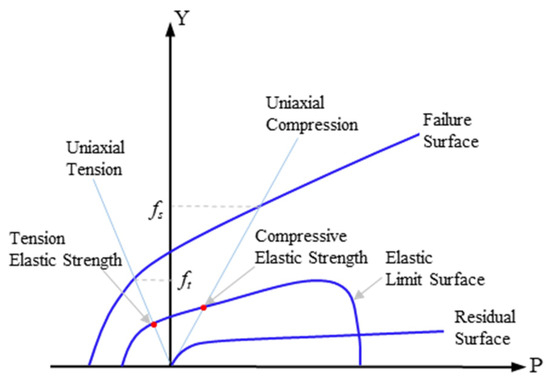 Under impact, the mechanical behavior of concrete is significantly changed due to the high strain rate of the material. Thus, a constitutive model that accounts for the high strain rate effect should be employed. The RHT model, developed by Riedel et al. [23], is a macro-scale material model capable of simulating the actual mechanical behavior of concrete under impact. Compared to other constitutive models, the RHT model considers the large stress, high strain rate, and high pressure of concrete; it can also predict both the elastic stage and the damage failure stage of the concrete [24]. The RHT model considers three pressure-dependent surfaces on the stress space (i.e., the elastic limit surface, failure surface, and residual surface for the crushing material), as shown in Figure 2. In addition, stress hardening, strain hardening, strain-rate hardening, strain softening, and third invariant dependence for compressive and tensile meridians are also taken into account in the RHT model. The mechanical behavior of the post-yield concrete is characterized by strain hardening, and that of post-failure concrete is characterized by damage.