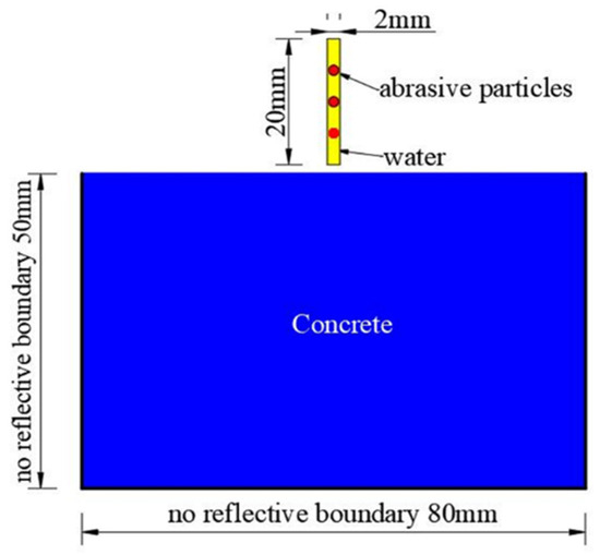 The concrete model subjected to abrasive waterjet is established, in which the concrete is regarded as the homogeneous material (Figure 3). To achieve a balance between computational efficiency and physical realism, a 2D plane stress model is employed. Although a full 3D model could provide more detailed representation of the stress wave propagation and crack evolution, the 2D plane stress model is widely accepted for the preliminary investigation of impact damage, especially when the out-of-plane stress components are relatively small compared to the in-plane responses. In the 2D plane stress model, the concrete model is simplified as a rectangle with a length of 80 mm and width of 50 mm; the abrasive particles are round, with a diameter of 0.8 mm, both of which are Lagrange meshes. To simulate the evolution of the damage for concrete subjected to abrasive waterjet, a large amount of the elements (308,828) are established through the FEM method. The length of these elements on the boundary is 0.2 mm with a 0.1 mm length for other parts. The waterjet is simplified as a rectangle with a length of 20 mm and a width of 2 mm, which is divided into 8000 SPH particles. Abrasive particles are established by the FEM mesh. To avoid the effect of the stress wave reflected from the free boundary during simulation, the bilateral and bottom sides of the concrete model are treated as non-reflective boundary conditions.