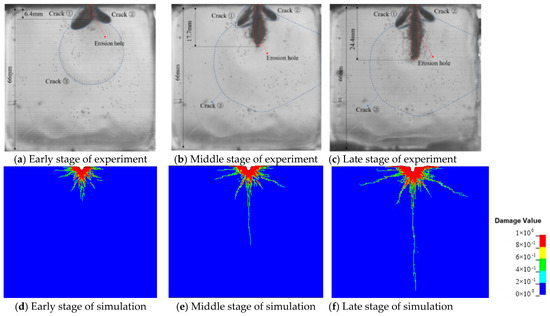 For quantitative calibration, RHT parameters were fitted to high-strain-rate compression data (error <5%), SPH–FEM contact stiffness and damping were tuned to match Liu et al.’s [20] pit depth and ~45° crack angle (error <10%). To clearly observe the concrete crack and its development, Liu et al. [28] used black ink to highlight the development of cracks in the concrete specimens subjected to abrasive waterjet, shown in Figure 4. When the cracks developed, they were quickly dyed by the black ink; therefore, the areas dyed black refer to the crack zone and other parts refer to no cracks. It can be seen that the conical cracks were generated first in the crushing zone when concrete specimens were subjected to abrasive waterjet (Figure 4a). In the middle stage, the speed of the conical crack development slowed down, with a quick development of the longitudinal cracks (Figure 4b). In the final stage, both the longitudinal and the conical cracks became stable, with a very slow speed of development (Figure 4c); only the central crack was quickly developed. Such crack development mechanisms and processes coincide with the presented simulation results shown in Figure 4d–f. The crack development mechanism found in this paper is also similar to that simulated using the JHC constitutive model [9]. Hence, the RHT constitutive model used in this paper is capable of capturing the main features of crack development and damage behaviors of concrete subjected to abrasive waterjet.