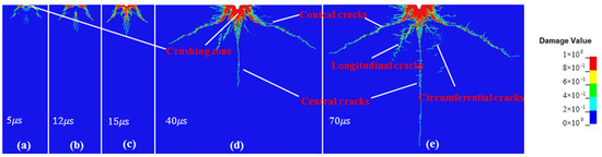 Figure 5 shows that at the beginning of the waterjet impact (5 μs), the effect of “water hammer pressure” is formed and the concrete is under compression. Water hammer pressure refers to the initial transient pressure surge caused by the sudden deceleration of the high-speed waterjet upon contact with the concrete surface. Those parts of the concrete not impacted by the abrasive waterjet could resist the compression, which could induce shear damage. The crushing zone is formed in the contact surface between the abrasive waterjet and concrete, which is at an angle of 45 degrees to the concrete surface. At 12 μs, the abrasive particles start to impact the concrete. Then, the concrete is damaged quickly along with the impact direction of abrasive particles due to the large amount of kinetic energy carried by the abrasive particles. After the impact of the first abrasive particle (15 μs), a clear “crater” and two conical cracks are formed. With continual erosion by the abrasive waterjet, conical cracks continue to expand and the crushing zone is enlarged. Finally, the depth and width of the cavity develop rapidly and central and circumferential cracks are gradually formed. In the later stage of the waterjet impact, the conical cracks and crushing zone expand slowly, whereas central and circumferential cracks expand rapidly. It can be found that the sizes of the cavity and the crushing zone at 40 μs and 70 μs are similar, which indicates that the damage of the concrete impacted by the abrasive waterjet changes slowly. The concrete damage in the early middle period (40 μs) is dominated by the increase in the crushing zone and the expansion of conical cracks. The impact depth is mainly developed at this stage and increases slowly in the later stage. In the later stage of the abrasive waterjet (70 μs), concrete damage is dominated by circumferential and central crack expansion.