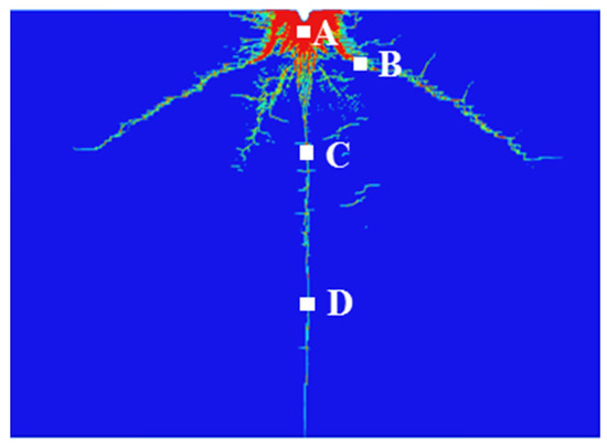 The cracks are shown in Figure 6; points A, B, C, and D are selected as monitoring points. The time history curves of maximum shear stress (τmax), maximum and minimum principal stresses (σ1 and σ3), and damage value Da (in which 0 is undamaged and 1 is fully damaged) for those points are shown in Figure 7. The observations described here are derived entirely from the numerical simulation results. Specifically, the stress wave propagation, damage accumulation, and failure patterns were evaluated at the four monitoring points (A–D) shown in Figure 6; their respective stress and damage histories are presented in Figure 7. These time history curves provide insight into how different regions of the concrete specimen evolve under abrasive waterjet impact. Point A, located closest to the impact surface, shows early plastic damage due to shear stress, while points B and C experience a transition from plastic to brittle failure. Point D, farther from the impact source, undergoes delayed tensile damage. This stage of damage behavior, visualized through simulation, enables classification of the concrete response into crushing, crack formation, and crack propagation zones based on numerical evidence.