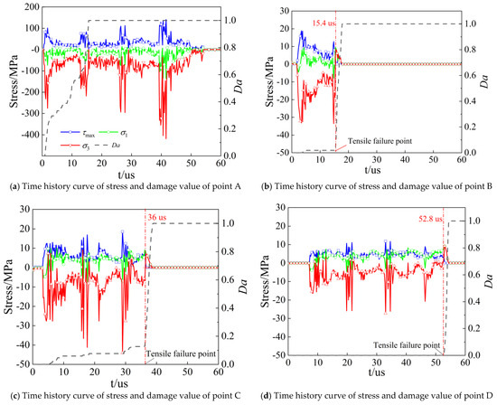 Time history curves of stress and damage value of points A, B, C, and D.