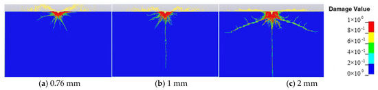 For the analysis of the effect of the jet diameter on the propagation of the cracks, three groups of jet diameters, 0.76 mm, 1.02 mm, and 2 mm, are considered. Other parameters, such as the velocity of the jet and the concentration of abrasive particles, are kept constant at 410 m/s and 25%, respectively. Considering the same concentration of abrasive particles, the impact kinetic energy is changed when setting different jet diameters. This causes the different concrete cracking effects. Figure 9 shows the influence of the jet diameter on the cracks. For the small jet diameter case (Figure 9a,b), the longitudinal and conical concrete cracks are not fully formed due to the smaller jet diameter carrying a lower mass of water and abrasive particles. With the increase in jet diameter, the longitudinal cracks and transversely developed conical cracks are gradually formed. For a jet diameter of 2 mm, the conical cracks extend more significantly, while the central crack is almost stable (Figure 9c).