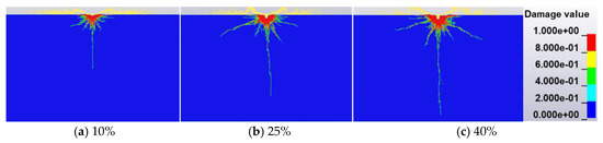 To investigate the effect of the velocity of the waterjet on the propagation of the cracks, different velocities of waterjet are selected (310 m/s, 410 m/s, and 510 m/s) while controlling other parameters as constant (jet diameter of 2 mm and concentration of abrasive of 25%). The velocity of the waterjet (e.g., the velocity of abrasive particles and water) determines the impact energy and thus has a significant influence on the development of the cracks in concrete subjected to the waterjet. It is shown in Figure 8 that the concrete crush zone is enlarged and that the concrete damage degree increases with the velocity of the waterjet. When the velocity of the waterjet is 310 m/s, the impact damage is concentrated near the contacted interface between the waterjet and concrete, with a small degree of damage (Figure 8a). When the velocity of the waterjet is 420 m/s, a large crushing zone forms, the conical cracks transversely extend, and the central crack is formed (Figure 8b). When the velocity of the waterjet reaches 510 m/s, the conical cracks and the central crack further extend and more damage to the concrete occurs. Thus, it is confirmed that a low waterjet velocity cannot effectively fracture the concrete.