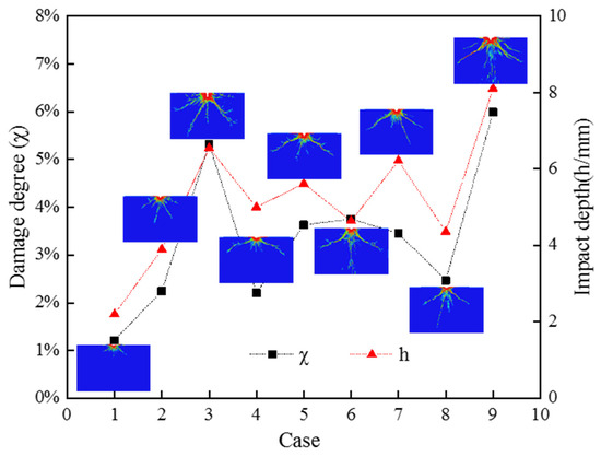 To find the best combination of jet parameters, the different groups of damage degree χ and impact depth h are compared and analyzed. Figure 11 shows the damage curves of damage degree χ and impact depth h under different working conditions. It is illustrated that for different jet diameters, the impact depth h and damage mode of concrete are different. Cases 1, 4 and 8 are featured as the small jet diameter (0.76 mm); their parameter combinations yield a small damage degree χ, a smaller crushing zone, and less sufficient crack propagation. Compared with the impact depth h of case 7, the impact depth h of case 6 is relatively shallow due to the small concentration of abrasive particles and large jet diameter; however, the damage degree χ of case 6 is larger than that of case 7. When the impact depth of the case is shallow, the jet has a large impact on the concrete surface, resulting in a larger range of transverse damage than longitudinal damage. Correspondingly, due to the high concentration of abrasive particles of case 7, the impact depth is significantly larger than that in case 6. Similarly, the concentrations of abrasive particles for cases 3 and 9 is the largest and the impact depth and longitudinal damage penetration are significantly deepened, which indicates the importance of abrasive particle concentrations on the impact depth for concrete.