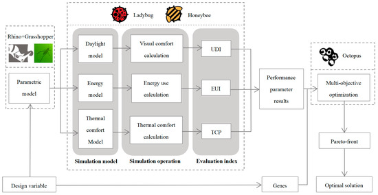 The overall optimization simulation process is shown in Figure 1, which is divided into three main links. Firstly, the seven relevant parameters of sunshading panel spacing, angle, and width, openable window area ratio, external insulation thickness, and external window glass type are selected as the optimization design variables, and a parametric model is established; in the second step, the model is linked with the above plug-in to simulate the light and thermal comfort and energy consumption, and the parameters of each index are derived before optimization; finally, the value interval of the optimization variables is determined and the seven design variables and three evaluation indexes are linked with the Octopus plug-in, and the Pareto-optimal solution set is derived through the intensity Pareto evolution algorithm and the hypervolume estimation algorithm [66]. And each optimization parameter exists independently without mutual interference; the evaluation metrics are dependent variables, which change due to the change in optimization parameters. The optimization process is carried out simultaneously with the multi-objective performance simulation of each generation, and the function increases the chance in convergence with the increase in the number of algorithmic generations, gradually approaching the optimal solution, and finally arriving at the Pareto frontier solution, and then filtering out the preferred solution according to the solution set.