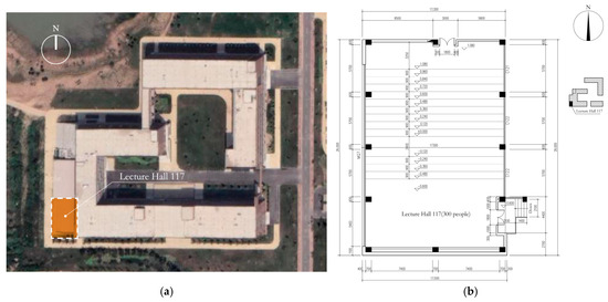 Classroom 117’s district and floor plan. (a) Location map of the classroom; (b) floor plan of the classroom, a tiered lecture hall.