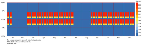 However, in the actual optimization process of teaching space in colleges and universities, energy consumption cannot be used as a single indicator as the basis for judging optimization, and it is also necessary to pay attention to performance indicators such as indoor lighting as well as thermal engineering [14,15]. In campus buildings, the tiered classroom is one of the typical space types in teaching with a high degree of representativeness. Lecture hall spaces are characterized by large depths, wide openings, high density of personnel, and high frequency of use, which determine more complex challenges in terms of lighting, thermal insulation, and ventilation [16]. Sadeghi et al. found that students spend approximately 30% of their school time in classrooms [17], and that the indoor thermal environment, light environment, and air quality can directly affect learning efficiency [18,19,20,21,22]. Specifically, Graça et al. suggested that thermal discomfort problems can affect mood, with behavioral responses such as reduced executive ability and reduced learning efficiency [23,24,25]. Maksoud et al. found that reasonable lighting design in educational buildings can ensure the visual comfort of classroom users, and the effective introduction of natural light can regulate the classroom student’s circadian rhythms [26,27], as well as reducing the level of student fatigue and helping them memorize information [28,29,30]. Wargocki et al. proved that improving indoor air quality can increase learning speed by 8–14% [31,32]; indoor thermal environment, light environment and air quality can even directly affect students’ health. When the human body’s tactile organs are stimulated, body heat is exacerbated, leading to muscle weakness, dizziness, and physical and mental fatigue [33,34,35,36,37,38,39].