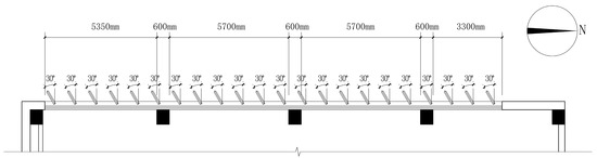 Since classroom 117 does not have shading elements, this provides a basis for retrofitting to optimize building performance. The east- and west-side shading elements are generally set in a vertical manner; in addition to the openable area of the window, the thickness of the external insulation layer is also closely related to indoor comfort, which will be included in the study considerations. As shown in Figure 3, the time period of this study excludes the influence of summer and winter vacations and includes the normal school hours of 8:30–12:00 and 13:30–17:00, as well as other specific parameters as shown in Table 1. Since classroom 117 only has windows on the east and west sides, and the east-side windows are adjacent to the narrow 2.6 m wide patio that separates the indoor space, it is not necessary to set up shading apparatus outside the east-side window openings, and this study takes the shading apparatus set up outside the windows on the west side of the tiered classroom as the design variables, and the members are rotated clockwise for negative values and counterclockwise for positive values (Figure 4). In addition, the possible effects of differences in the heat transfer coefficient K, shading coefficient SC, and visible light transmission ratio Tvis on the optimization results were considered when the type of external window glass was the design variable.