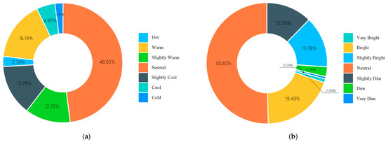Pie chart of subjective evaluation of winter solar thermal comfort. (a) Subjective evaluation map of thermal comfort in winter; (b) subjective evaluation map of light comfort in winter.