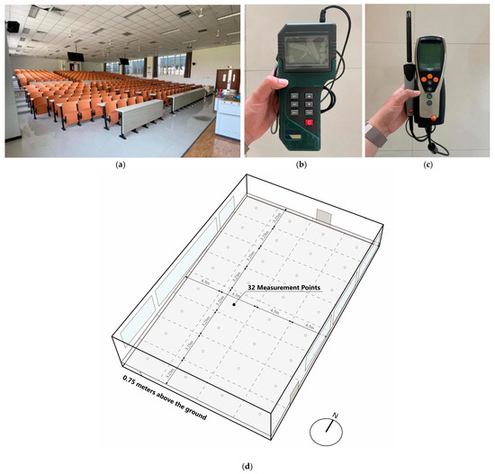 Diagram of the actual classroom, measuring points and measuring instruments: (a) classroom 117; (b) MW18-JTG01 Illuminance Meter; (c) testo635 portable temperature and humidity meter; (d) distribution of classroom test points.