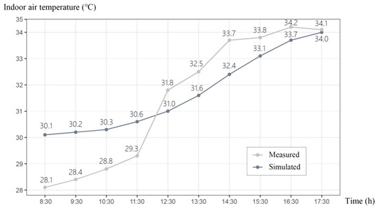 Initial organization of the data yielded similar distribution patterns for the measured and simulated illuminance data, indicating that the model is capable of generating realistic data. In order to quantify the differences, the variance was calculated using the mean bias error (MBE) and the root mean square error coefficient (CV (RMSE)), which are statistics that characterize the similarity/difference between two data series. MBE indicates that one data series is larger or smaller than the other. RMSE indicates the degree to which one data series “fluctuates” with respect to the other data series [78]. Acceptable limits for thermal model calibration are defined according to ASHRAE Guide 14-2014: a thermal model is considered calibrated if the calculated MBE is within ±10% and the CV (RMSE) is within ±30% when analyzing hourly data [79]. Figure 7 shows the measured versus simulated indoor temperatures at 1 h intervals from 8:30 A.M. to 17:30 P.M. on 10 June 2024. Substituting the measured and simulated values of temperature into Equations (10) and (11) yields MBE and CV (RMSE) of −0.73% and 3.9%, respectively. Therefore, the error of the thermal model is within acceptable limits.