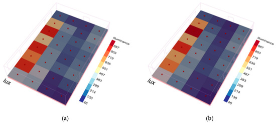 Comparison of simulated light level and actual light level. (a) View of simulated light levels at 12:00 on 10 June 2024; (b) view of measured light levels at 12:00 on 10 June 2024.