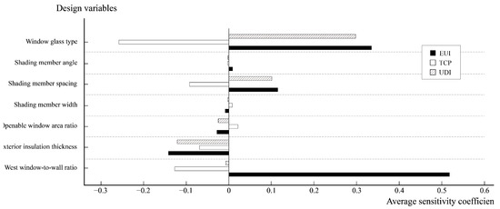 For the sensitivity analysis of the performance indicators, the input parameters include seven envelope parameters, namely, openable window area ratio, west window-to-wall ratio, external insulation thickness, shading member spacing, angle, and width, and external window glass type, and the output parameters are three evaluation indicators, namely effective daylight intensity (UDI), energy use intensity (EUI), and thermal comfort time percentage (TCP).