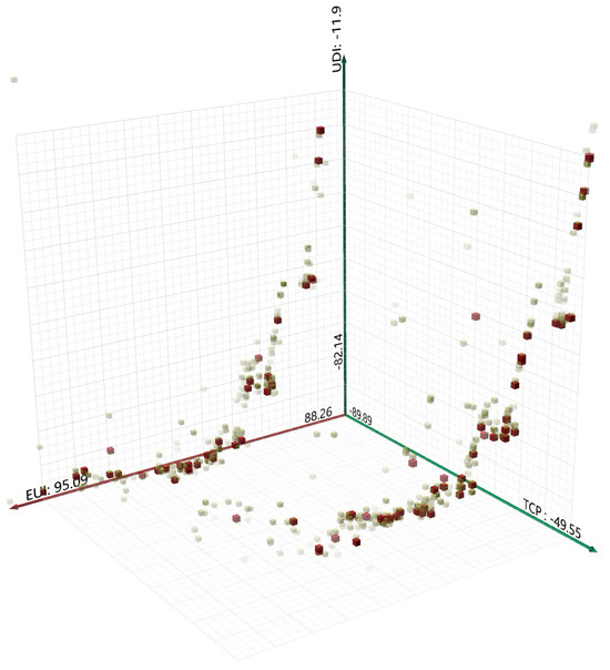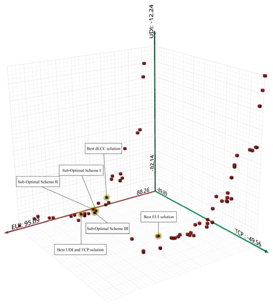 In this study, we need to simultaneously optimize the three objectives of EUI, UDI and TCP to obtain the Pareto frontier solution set to find the optimal solutions for each of the three objectives. The parameters of elasticity, mutation probability, mutation rate, and crossover rate in Octopus are set to 0.5, 0.1, 0.9, and 0.8, respectively. The population size is set to 50. Since Octopus uses SPEA-2 automatic control design variables with hyper-mutation, it will continuously search for the minimum value of the three objectives, so the targets to be maximized, effective daily illuminance, UDI, and thermal comfort percentage (TCP), will both be multiplied by −1.