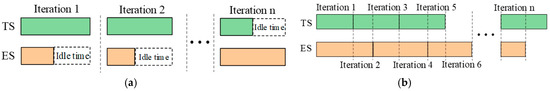 When using the traditional ADMM algorithm to solve the above subproblems, the control center needs to participate in the solution, which poses a privacy leakage risk. The synchronous parallel ADMM (SP-ADMM) algorithm can complete the solution without the participation of the control center, thereby better protecting the privacy of each subject. However, the solution to each subsystem needs to be synchronized, and there is a lot of idle time; the solution time is shown in Figure 2a. An asynchronous decentralized ADMM (AD-ADMM) algorithm is a distributed optimization algorithm designed to address the resource waste and high privacy leakage risks caused by synchronous parallel mechanisms in traditional centralized optimization methods. Its core feature lies in the combination of an asynchronous parallel solving mechanism and a decentralized architecture. The solution time of AD-ADMM is shown in Figure 2b, and the solution process can be described as follows: