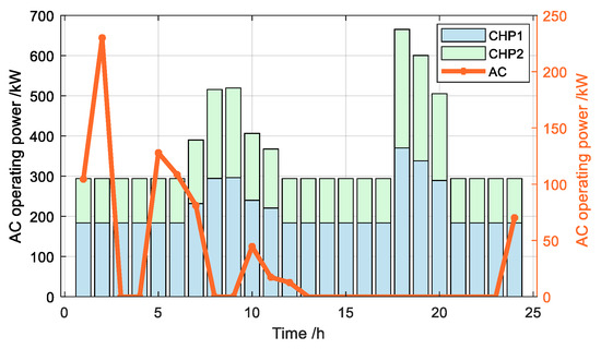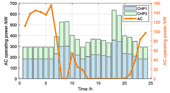 When user comfort is not considered, the internal temperature of the building is set to remain constant at 22 °C. The optimized outputs of the heating equipment (AC and CHP unit) are shown in Figure 5.