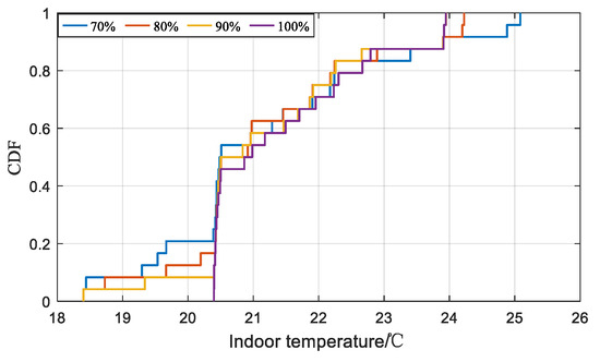 Figure 7 presents the cumulative distribution function (CDF) of indoor temperature under different confidence levels, averaged across 100 Monte Carlo runs. As the temperature increases from 18 °C to 26 °C, the cumulative probability transitions from 0 to 1. At full confidence, the building temperature lies entirely within the comfort range (20–24 °C). As the confidence level decreases, the range of indoor temperature variation gradually increases. When the confidence level is 90%, the indoor temperature remains bounded above by 24 °C, but its lower bound decreases to 18 °C. When the confidence level is 80%, both temperature bounds slightly exceed the comfort range, although the extent of the exceedance is not significant. When the confidence level drops to 70%, the upper and lower temperature limits further expand beyond the comfort range. A lower confidence level can provide greater flexibility in adjusting the indoor temperature, but it also increases the risk of the indoor temperature exceeding the comfort range. Therefore, a balance between the confidence level and user comfort needs to be considered when formulating scheduling strategies.
