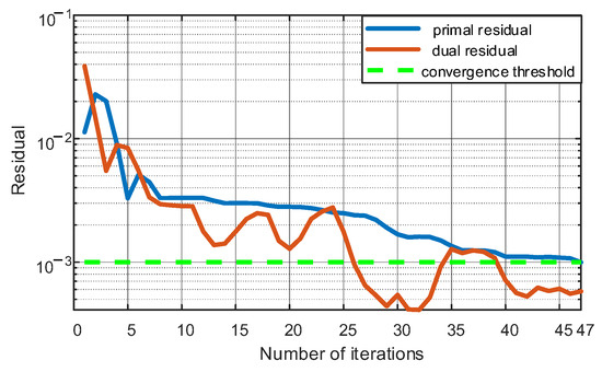 Figure 8 shows the convergence curves obtained using the A-AD-ADMM algorithm to solve the optimal scheduling strategy while considering user comfort. Both the primal residual and the dual residual reach the convergence threshold. Moreover, the operating cost of the EH-IES obtained by the distributed optimization method differs from the centralized result by only 0.15%, indicating the accuracy of the A-AD-ADMM used in this paper.