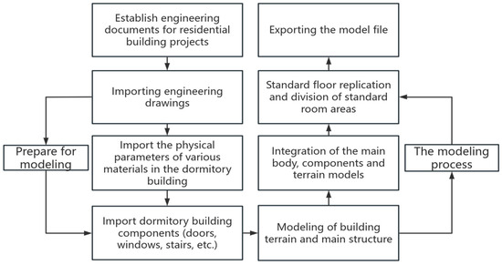 The second step involves developing the Building Information Model (BIM). In this study, Autodesk Revit software is chosen for BIM due to its basic element is the real (true) object “family”, which facilitates parametric design, setting different parameters for different families. Parametric modeling enhances the standardization and precision of BIM. In addition, the modeling software Revit and the analysis software interact correctly with each other through the DWF format and the SXF format. The Autodesk Revit 2018 modeling process is demonstrated in Figure 2. The project’s engineering information parameters were used from the original building design data.