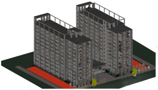 The first step in the process involves site selection. The building selected for this paper (Figure 1) is situated in Mianyang City, Sichuan Province, which falls within China’s building climate zone III, characterized by hot summers and cold winters. The dormitory building is classified as a type II high-rise student dormitory with 11 floors above ground and a total floor area of 27,611.38 square meters. The dormitory building features a total height of 40 m, a design service life of 50 years, and a fire resistance level of Grade II. Its structural system comprises a reinforced concrete frame-shear wall structure with a seismic intensity of 7 degrees, the benchmark for measuring the seismic resistance of buildings.
