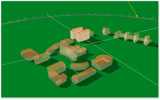 The third step involved conducting integrated indoor and outdoor physical environments of the building model using Swire Energy Analysis software, which has embedded mathematical formulas for calculations. The data obtained from the calculations for the model under different operational scenarios are systematically utilized for predictive performance analysis. For example, the Revit model was imported into the energy-efficient design software BECS for refinement. Firstly, the model undergoes a thorough check for overlaps and alignment between the wall column, the model itself, and the wall base. Subsequently, following operations such as setting the layer heights, numbering doors and windows, searching the room, and building outline operation, the analyzable 3D model is finalized (Figure 5). Subsequently, in line with the project’s overall plan, the modeling of the surrounding buildings is undertaken. The main steps in this process include importing CAD drawings, drawing building profile curves, defining the height of the building profile, naming the building, as well as finally initiating the analysis of the outdoor wind environment and sunlight exposure on the model (e.g., Figure 6). The energy-saving design software BECS is used to calculate a single three-dimensional model. Firstly, the software’s default project settings, project structure, and project detail information are refined and adjusted in accordance with the project design instructions. Subsequently, relevant data is extracted from the model for the next step of energy consumption calculation and energy-saving compliance verification.