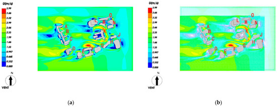 Simulation Analysis of Outdoor Wind Environment in Winter (A, B, C, etc. represent surrounding numbered buildings). (a) Wind Speed Cloud at 1.5 Meter Height Level in the Computational Domain. (b) Cloud View of Wind Speed Amplification Factor at 1.5 Meters Height in the Computational Domain.
