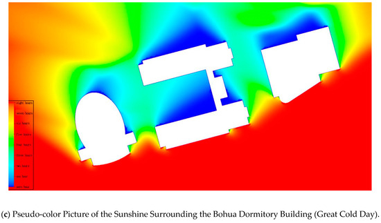 Sunshine Simulation Analysis of the Combined Model. (Red for high temperatures, color gradient bars for decreasing temperatures and blue for low temperatures in the figure).