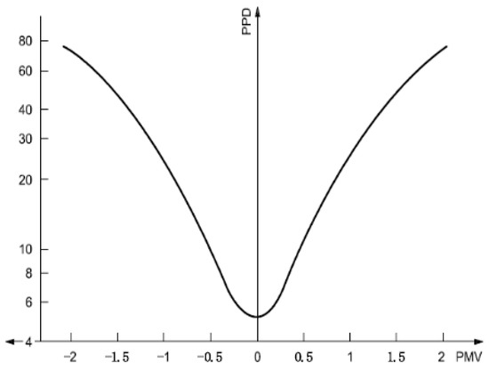 The relationship between PMV and PPD is depicted in Figure 11, where PMV reflects the subjective evaluation of the vast majority of the number of participants. Specifically, when PMV is 0, and PPD is 5%, it implies that approximately 5% of individuals may still perceive the environment as slightly warm or cool.