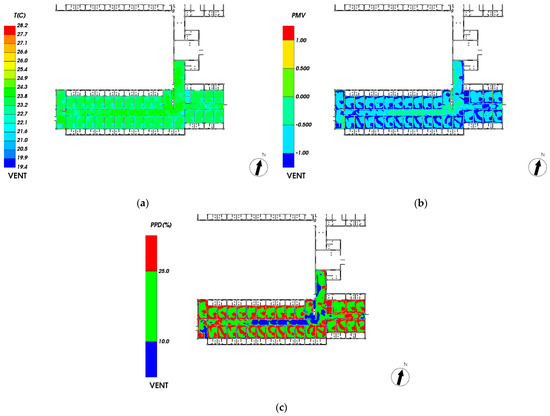 Simulation and Analysis of the Heat and Wet Environment of the South Building of the First Ground Floor. (a) Temperature Field Distribution at the Pedestrian Height. (b) PMV Distribution at the Pedestrian Height. (c) PPD Distribution at the Pedestrian Height.