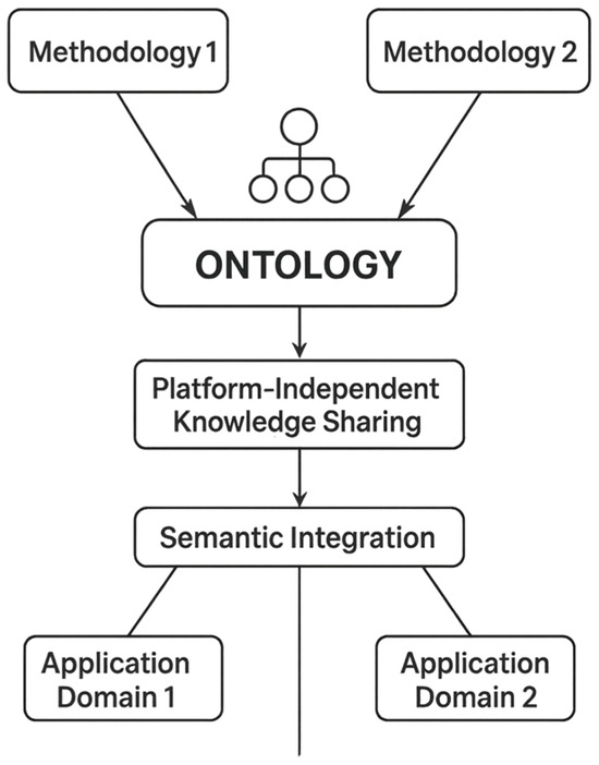 Extensive research has been conducted to address interoperability challenges across diverse methodologies and application domains. As depicted in Figure 2, ontologies have been increasingly utilized as strategic tools to facilitate platform-independent knowledge sharing and semantic integration. Numerous studies have focused on developing ontology-based systems to enhance knowledge exchange within information technology platforms [20,21]. Aziz et al. [22] introduced a prototype application employing a semantic resource description framework to enable context-aware information delivery. In a related effort, Wang et al. [23] proposed a novel approach for managing situation-sensitive construction data. The usefulness of ontology in supporting classification systems for effective knowledge sharing was also emphasized in Wang et al.’s earlier study [18]. Several researchers have contributed to ontology-driven taxonomy construction and classification frameworks, including Rezgui [24], Elghamrawy and Boukamp [25], El-Diraby and Zhang [26], and Niu and Issa [27]. Lin et al. [20] presented an ontology-based extraction concept to ensure the relevance, accuracy, and completeness of domain knowledge, while Yurchyshyna et al. [28] proposed an ontological approach for verifying conformance in data systems. Benevolenskiy [29] advanced a process- and ontology-based framework to standardize simulation workflows in construction. Ontology frameworks have also been explored in sensor-based building monitoring systems [30], as well as in text-based knowledge processing. Zhou and El-Gohary [31] developed an ontology-based semantic classification model and later proposed a technique for automated information extraction.