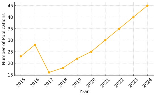 This study undertook a review of the recent literature to assess prevailing themes and research directions in ontology applications in construction. The increasing volume of studies in recent years reflects a growing academic and practical interest in ontology research; between 2015 and 2024, the number of ontology-related publications in construction increased from 23 to approximately 45 (with a dip to 16 in 2017), as illustrated by the yearly publication trend graph inserted in the main text. This trend, which illustrates a growing interest in ontology due to digital transformation in construction, is expected to continue as construction projects become more data-intensive and reliant on information and communication technologies (Figure 3) [37].