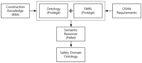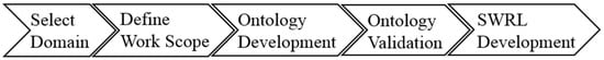 This study proposes a construction safety domain ontology, developed using the Protégé ontology editor, to define the structure of classes, relationships, and axioms. The consistency and coherence of the constructed ontology were evaluated using OWL reasoners and competency questions. To formalize safety knowledge based on OSHA regulations, Semantic Web Rule Language (SWRL) rules were also developed and implemented within the ontology framework [37]. The rule sets were designed to be adaptable, allowing domain experts to modify and extend them according to specific contextual requirements. Figure 4 outlines the generalized methodology for domain ontology development, which served as the foundation for this research.