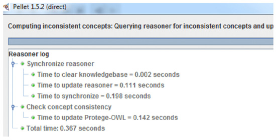 In addition to class hierarchy modeling, SWRL rules were developed and embedded within the ontology using Protégé to formalize OSHA safety regulations and support rule-based reasoning. All term definitions were referenced and refined using Termium Plus, Merriam-Webster, Wikipedia, and selected technical handbooks, and modified according to established ontology engineering principles [44]. To ensure semantic consistency and domain relevance, terms sourced from Revit (representing BIM component naming), OSHA (regulatory terminology), and Termium Plus (standardized language definitions) were systematically cross-validated. The cross-validation process involved mapping similar terms across the three sources, resolving naming inconsistencies, and selecting terminology that aligned with both construction site practices and regulatory contexts. In cases of conflict or ambiguity, OSHA definitions were prioritized for regulatory accuracy, while Revit terms were used to ensure compatibility with BIM environments. The finalized terms were then standardized and encoded into the ontology structure. The finalized ontology model was validated using reasoning tools and competency question queries. As shown in Figure 6 and Figure 7 the ontology was verified using Pellet, an integrated reasoner in Protégé. The consistency check confirmed that no logical inconsistencies existed within the class hierarchy, object properties, or axioms. Figure 5 illustrates the reasoning process, including the inferred class relationships and the successful result of the consistency validation in the Pellet output console.