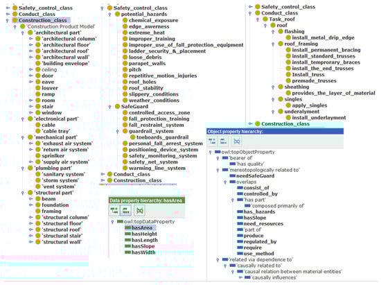 - Wang, H.; Boukamp, F. Ontology-Based Representation and Reasoning Framework for Supporting Job Hazard Analysis. J. Comput. Civ. Eng. 2011, 25, 442–456. [Google Scholar] [CrossRef]