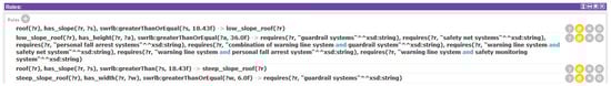 In this study, the regulatory provisions outlined by OSHA were translated into machine-readable SWRL rules to enhance the semantic reasoning capabilities of the ontology. This transformation enabled the more precise integration of OSHA regulations with ontology-based risk detection and prevention mechanisms. As an illustration, Table 4 presents the mapping of OSHA safety requirements into their corresponding SWRL rule representations, including SWRL3 and SWRL4, which address roof-related fall hazard scenarios. It should be clarified that the safety systems represented in SWRL3 and SWRL4 are not intended to be applied concurrently. Rather, they reflect a set of conditional alternatives as defined in OSHA regulations, contingent upon specific contextual factors such as roof slope and width. Accordingly, the ontology interprets these rule elements using conditional logic to preserve semantic alignment with regulatory intent and practical applicability in real-world scenarios.