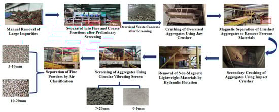 Field investigations at the aggregate processing facility revealed that the primary raw materials consist of construction and demolition waste originating from building demolitions in Shenyang and its surrounding areas. Most of these structures were built during the 1970s and 1980s and are predominantly brick–concrete constructions. The production process follows a standardized procedure to ensure the stability and representativeness of the recycled aggregate quality. Prior to entering the recycled aggregate processing system, the construction waste undergoes a series of physical sorting, crushing, and screening operations. As illustrated in Figure 2, the overall process can be divided into several major stages. The red rectangles in the images indicate the coarse, fine, or crushed aggregates corresponding to each processing step.