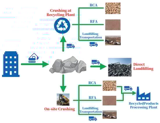 To systematically evaluate the environmental benefits of converting construction waste into recycled aggregates, it is essential to clarify the resource consumption and pollutant emission pathways associated with different disposal methods. This section delineates the assessment scope into two alternative pathways: direct landfilling of construction waste and its recycling. The landfilling pathway primarily encompasses three stages: waste generation, transportation, and final disposal in landfills. In contrast to the former, the recycling pathway encompasses waste generation, transportation, recycled aggregate production, and the landfill disposal of residual materials. The recycling route is further divided into two technological approaches—stationary and mobile recycled aggregate production—based on the processing method employed.