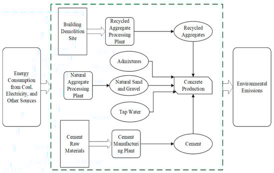While enabling the recycling of construction waste, this process flow also introduces new considerations in terms of energy consumption and carbon emissions. It provides reliable and accurate data to support subsequent life cycle environmental impact assessments. Based on the field investigation, the system boundary for the life cycle assessment of recycled aggregates is defined as shown in Figure 3.