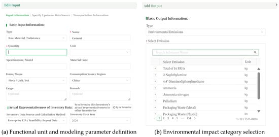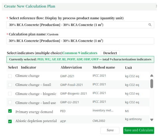 Raw material consumption, energy use, and emission data were normalized based on the functional units of 1 ton of recycled aggregate and 1 m3 of C30 recycled concrete, respectively, and input into the modeling module of the platform. Under consistent system boundaries, impact categories, and database settings, environmental impact models were constructed for different scenarios. The platform utilizes CLCD 0.9 (Chinese Life Cycle Database) as the background database to ensure regional representativeness of the assessment results. Figure 5 presents the interface for selecting functional units and environmental indicators within the platform.