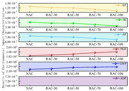To systematically assess the environmental impacts of recycled aggregate concrete under different replacement ratios of recycled aggregates, this study follows ISO standards and uses the eFootprint platform to convert inventory data into six typical impact categories, covering key dimensions such as resource use, energy consumption, and environmental emissions, including ADP, PED, RI, EP, GWP, and AP.