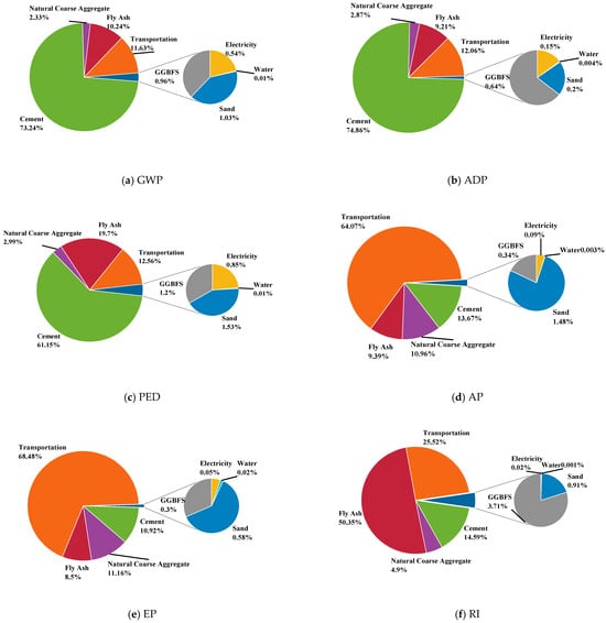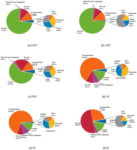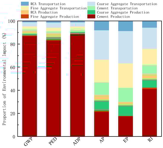 The findings indicate that, for the GWP, PED, and ADP indicators, the cement production stage accounts for 86.39%, 82.17%, and 88.62% of the total impact, respectively—each exceeding 80%—making it the dominant source of environmental burden. This is mainly due to the substantial emissions of pollutants and greenhouse gases during the clinker calcination process. The aggregate transportation stage is a secondary contributor, accounting for approximately 7% to 9%. Other stages such as cement transportation, aggregate transportation, and recycled aggregate production have relatively minor contributions; however, for certain indicators, long-distance transport and associated diesel consumption still represent a notable environmental load.
