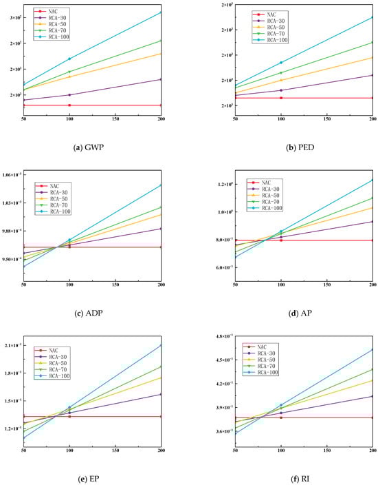 As demonstrated in the previous analysis, the transportation stage is the second most significant environmental contributor in concrete production, following cement. To further explore this impact, we conducted an in-depth analysis of how varying transportation distances influence multiple environmental impact categories during the production of recycled aggregate concrete. As shown in Figure 9, increases in transportation distance generally lead to a rise across all six environmental impact categories during the production of recycled aggregate concrete.