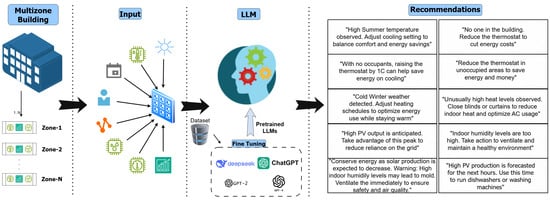 The proposed control strategy leverages fine-tuned Large Language Models (LLMs) to generate proactive, context-aware recommendations that optimize energy efficiency and occupant comfort in smart buildings. By processing real-time environmental and operational data, the system dynamically adapts to evolving building conditions and external factors. Traditional energy management approaches often rely on static, rule-based logic, which may struggle to maintain performance across diverse and changing environments. In contrast, the proposed method employs advanced Natural Language Processing (NLP) to interpret complex data streams and generate flexible, human-readable recommendations that anticipate future building needs. The control framework continuously collects and processes real-time sensor data, including temperature, humidity, solar radiation, occupancy, energy consumption, and predicted photovoltaic (PV) production, through the fine-tuned LLM. The model outputs actionable, zone-specific recommendations aligned with current and forecasted conditions. These outputs can be delivered directly to building occupants, facility managers, or integrated into automated Building Management Systems (BMSs) for execution, enabling seamless compatibility with existing control infrastructures. The operational logic emphasizes not only current sensor values but also predictive data (e.g., 3 h forecasts), enabling anticipatory adjustments that optimize both immediate and future building performance. The system’s adaptability is further supported by parameter normalization, ensuring consistent performance across buildings of varying size and operational complexity. Overall, the control strategy demonstrates how LLMs can support real-time, adaptive energy management in complex, multi-zone building environments.