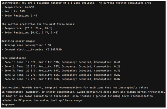 The success of the recommendation approach is dependent on the composition of various environmental, operational, and building-specific data sources. The input prompt provided to the language models is carefully structured to simulate the perspective of a smart building manager overseeing multiple zones, requiring proactive energy and comfort management. Environmental inputs include real-time ambient outside temperature, humidity, and solar radiation measurements and three-hour forecasts for temperature and solar radiation. Zone-specific parameters retain indoor conditions in each zone, such as temperature, humidity, occupancy, and real-time energy usage measurements. Operational information, such as the building’s average energy consumption and current electricity price, is also incorporated to allow the system to weigh cost-optimized recommendations.