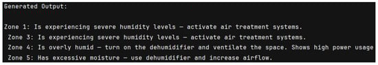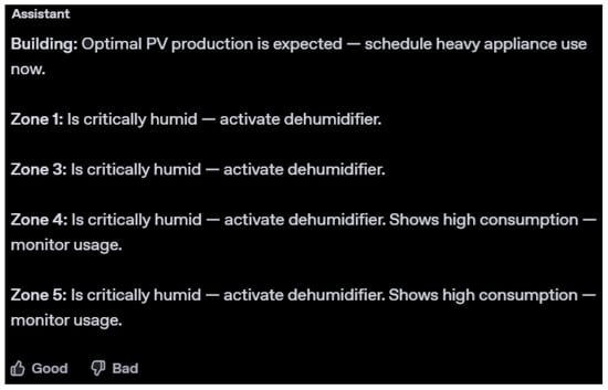 Furthermore, Figure 5 showcases the output generated by the GPT-4 model for the same scenario. GPT-4’s recommendations included both a building-level suggestion, highlighting the opportunity to optimize appliance usage during high PV production, and precise, zone-specific advice for each affected area. Notably, GPT-4 maintained clear and structured language, recommending dehumidifier activation in all critically humid zones and monitoring of energy consumption where high usage is detected. This output reflects GPT-4’s ability to balance clarity and operational relevance while addressing both building-level and zone-specific needs.